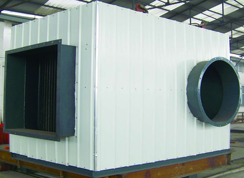 KJQ型礦井空氣加熱器主體結(jié)構(gòu)為空氣加熱器、風機、設(shè)備基座及控制部分構(gòu)成(屬敞開式結(jié)構(gòu)),將其安裝在保溫的空間內(nèi)形成一個箱體式結(jié)構(gòu)。